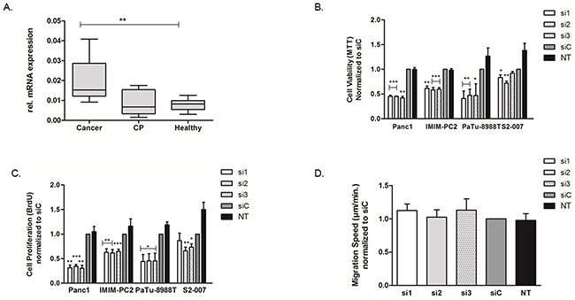 Figure 2: Upregulation of USP5 and its role in in pancreatic cancer. USP5 mRNA expression was quantified by realtime PCR (qRT-PCR) and normalized to ribosomal protein, large, P0 (RPLP0) mRNA levels. (A) Expression in malignant tissues (n=10) was significantly increased compared to healthy controls (n=8) or chronic pancreatitis tissues (n=6). CP = Chronic Pancreatitis. (B, C) Transient loss of USP5 function significantly reduced proliferation and viability of four different pancreatic cancer cell lines as assessed by their ability to metabolize MTT reagent (B, viability index) or incorporate BrdU agent (C, proliferation index) as compared to non-silencing control siRNA (siC) or untreated cells (NT). (D) USP5 knockdown however had no impact on the migration speed of PaTu-8988T cells, as assessed by Time Lapse Microscopy and automated cell tracking. si1, si2 and si3 = three specific siRNAs against USP5. siC = non-silencing control. NT = untreated cells. *p<0.05, **p<0.01, ***p<0.001; Student’s T-Test. n≥3 for each experiment.