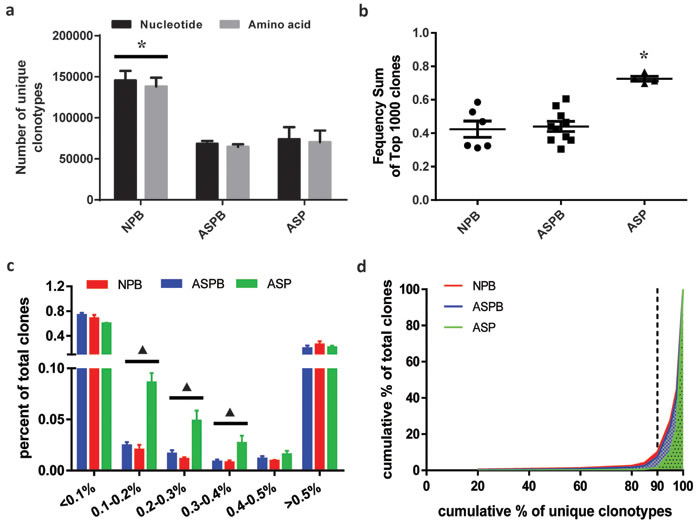Figure 1: The characteristic types and frequency distributions of T cell clones in patients with atherosclerosis (AS). a. At the amino acid and nucleotide levels, the unique clonotypes of the T cells in the peripheral blood of healthy subjects (NPB) were significantly more than those in the peripheral blood (ASPB) and plaques (ASP) of patients with AS. *: p < 0.05 vs. all other groups. b. The sum of the frequency of the top 1000 T cell clones from AS plaques (ASP) was significantly higher than that from the groups of NPB and ASPB. *: p < 0.05 vs. all other groups. c. The percent of total T cell clones in different intervals of clonal frequency was analyzed as described in Methods. The T cell clones in the AS plaques (ASP) were significantly elevated compared to those in the other two groups in certain frequency intervals (0.1-0.4%). ▲: p < 0.05 vs. NPB and ASPB at the corresponding frequency intervals. d. The cumulative percentage of the unique T cell clones was analyzed. The unique T cell clonotypes with high-frequency in the AS plaques (ASP) were more than those in the other two groups (ASPB and NPB).