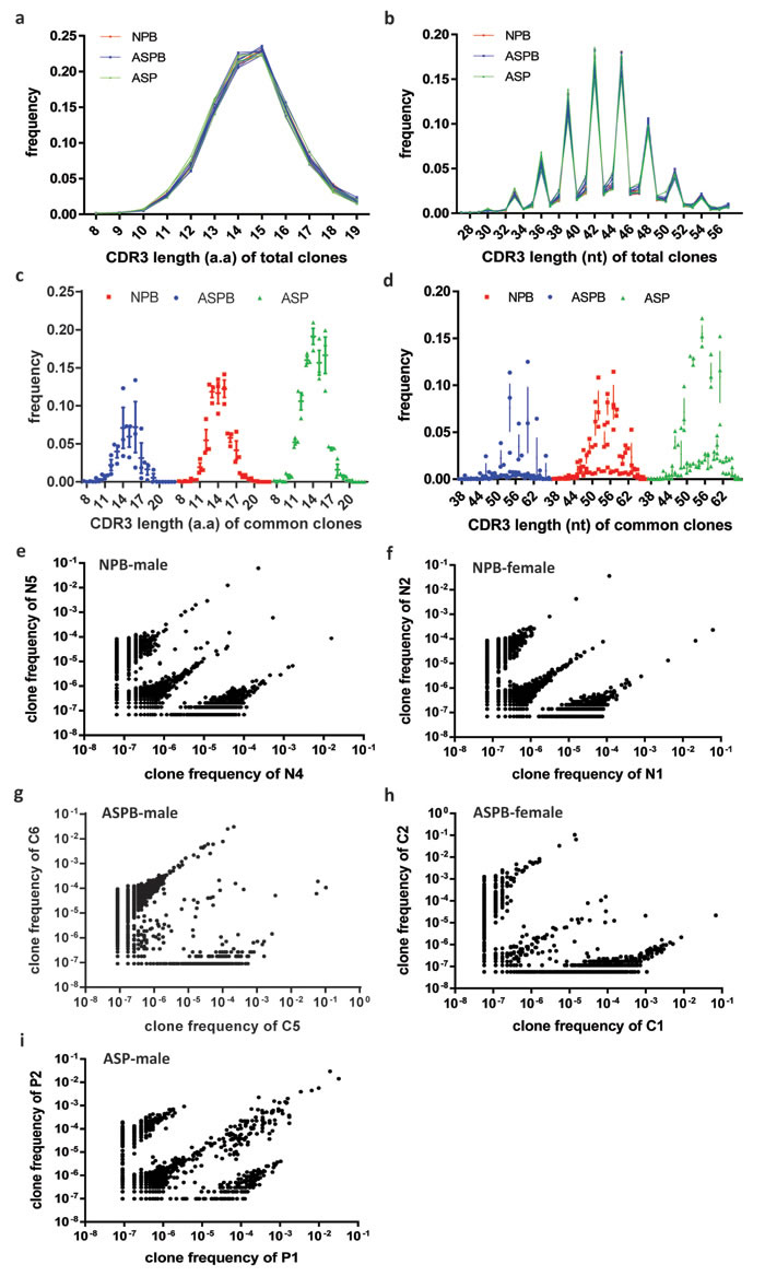 Figure 2: Distribution of CDR3 lengths of common/total T-cell clones and the frequency of common clones between individuals. a. and b. The distributions of CDR3 lengths of the total T-cell clones were not significantly different among the three groups at the amino acid a. and nucleotide b. levels. All groups showed a normal distribution. c. and d. The distributions of CDR3 lengths of the common T-cell clones in each group at amino acid c. and nucleotide d. levels. The frequencies of the common T-cell clones with 13-15 amino acids length were notably higher in AS plaques (ASP) than in the other two groups (NPB and ASPB). The frequencies of the common T-cell clones with certain nucleotides lengths (such as 52, 55 and 58) in ASP were markedly higher than those in the other two groups. e.-i. The frequency distributions of the common T-cell clones among the different individuals in the same group. The frequency distribution and the number of common T-cell clones in the peripheral blood of normal males e. and females f. were similar and notably higher than those in the peripheral blood of male g. and female h. patients with AS. The number of common T cell clones in ASP i. were markedly higher than those in the other two groups.