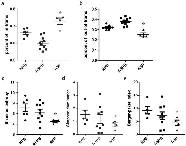 Figure 3: Analysis of the open reading frame and diversity of T cell clones. a. The proportion of in-frame T-cell clones in the AS plaques (ASP) was significantly higher than that in the other two groups (NPB and ASPB). *: p < 0.05 vs. all other groups. b. The proportion of the out-of-frame T-cell clones in the AS plaques was significantly lower than that in NPB group and ASPB group. *: p < 0.05 vs. all other groups. c.-e. The diversity of T cell repertoires in all three groups was analyzed as described in the Methods. The diversity indexes of the T cell clones, including Shannon entropy c., Simpson dominance d. and the Berger-Parker index e., were all significantly decreased in the AS plaques, suggesting that the diversity of T cell repertoire in AS plaques was less than that in the other two groups. *: p < 0.05 vs. other two groups.