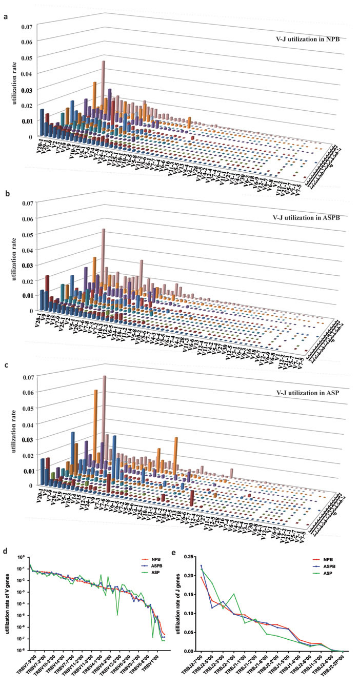 Figure 4: Significant changes in V-J gene utilization of T cell repertoires in AS plaques. a.-c. The utilization rates of the V-J genes in all three groups. There were no notable differences in the overall profiles of the V-J gene utilization of T cell repertoires in the peripheral blood between normal subjects a. and patients with AS b.. The V-J gene utilization of the T cells clones in the AS plaques c. was obviously reduced, and high-frequency clones were markedly increased. d. and e. The distribution profiles of the utilization of V genes d. or J genes e. were essentially similar in all three groups. However, the utilization of some V genes (such as TRBV4-1, TRBV5-4, TRBV12-4) and J genes (such as TRBJ2-5, TRBJ2-1, TRBJ1-6) in the AS plaques was notably different from those in the other two groups.