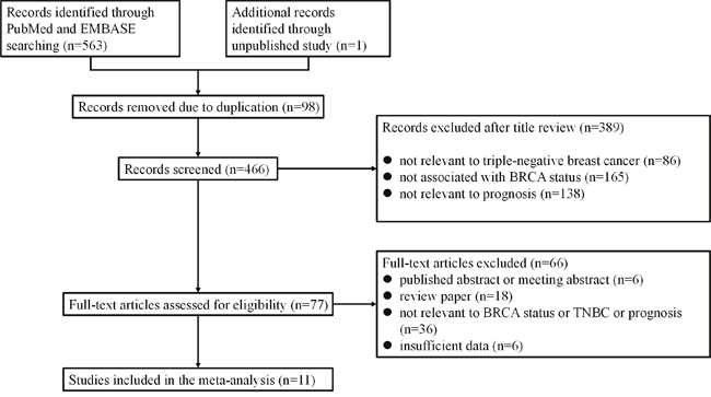 Eligible studies met the following predefined criteria: (1) Case-control studies that addressed the prognosis of TNBC patients, according to BRCA status (BRCA1/2 mutations, BRCA1 promoter methylation in the primary tumor, and/or BRCA1/2 protein expression); (2) Studies in which the primary outcome was OS, DFS and/or RFS; (3) Papers with sufficient published data for calculating the hazard ratios (HRs) and 95% confidence intervals (CIs); (4) Studies that were confined to human females. (5) The studies with the largest sample size were included if the same patient population were overlapped among publications.