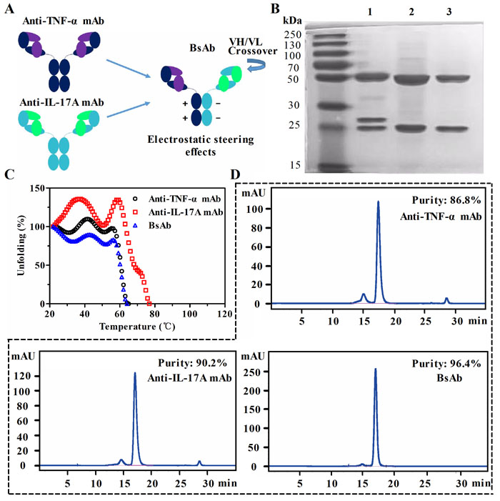 Figure 1: Generation and characterization of anti-TNF-α/IL-17A bispecific antibody (bsAb). A. Schematic diagram of bsAb generated by fusion of anti-TNF-α antibody and anti-IL-17A antibody. BsAb consists of a crossed anti-IL-17A arm (CH1-C exchange) and an uncrossed anti-TNF-α arm. The parental monoclonal antibodies (mAb) are shown on the left. Fc parts of heavy chains are paired through an electrostatic steering effects. B. SDS-PAGE analysis of purified bsAb (lane 1), anti-IL-17A mAb (lane 2), and anti-TNF-α mAb (lane 3). C. Comparison of thermal stability of three antibodies by circular dichroism. D. The purity analysis of bsAb and parental mAbs by a size exclusion chromatography column.