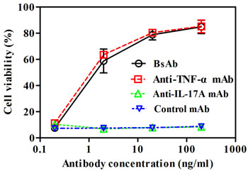 Fibroblast L929 cell line has been used for the standard analysis of TNF-α cytotoxicity [22]. We employed assays to assess the ability to prevent TNF-α-mediated cell cytotoxicity. BsAb inhibited TNF-α-induced L929 cell cytotoxicity in a dose-dependent manner, which was comparable to that of anti-TNF-α mAb (Figure 4). Anti-IL-17A mAb and control anti-IGF-I/II mAb m708.5 had no effect on neutralization of TNF-α.