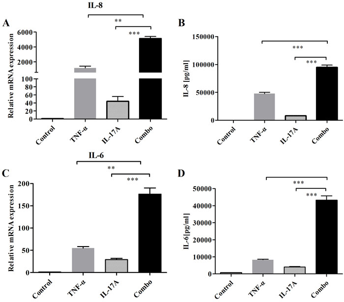 Figure 5: Addition and synergy of combined IL-17 and TNF-α to induce the production of IL-6 and IL-8 on FLS. A. After cells were stimulated with IL-17 and TNF-α for 12 h, mRNA expressions of cytokines (IL-6, IL-8) were determined by realtime-PCR. B. Secretions of cytokines (IL-6 and IL-8) in culture media were measured by ELISA. All results are representative of at least three independent experiments.