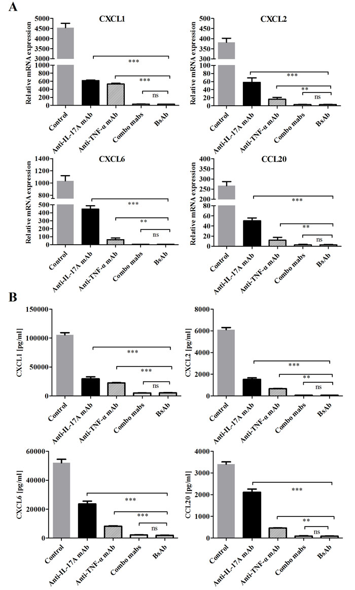 Figure 6: Inhibition of bsAb on the production of neutrophil and Th17 chemokines on FLS. A. FLS cells were incubated with IL-17 and TNF-α or in the presence of different, antibodies. The mRNA expression levels of CXCL1, CXCL2, CXCL6, and CCL20 were measured by realtime-PCR after stimulation for 12 h. B. After FLS were treated, the secretion of chemokines from RA-FLS were measured by ELISA. All results are representative of at least three independent experiments.