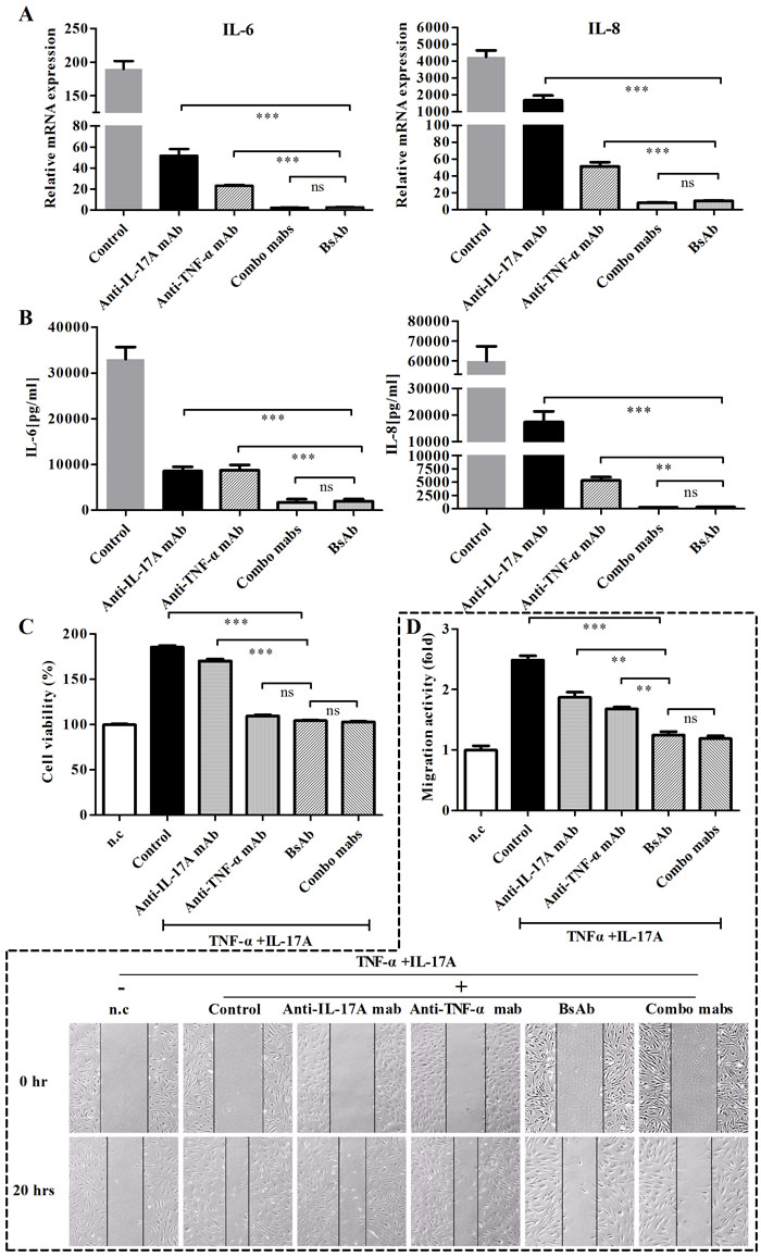 Figure 7: Inhibition of bsAb on the production of IL-6 and IL- 8 and proliferation, and migration of FLS. FLS cells were stimulated with TNF-α and IL-17A or in the presence of different, antibodies. A. The mRNA levels of IL-6 and IL- 8 were determined by realtime-PCR. B. Secretions of cytokines (IL-6 and IL-8) in culture media were measured by ELISA. C. Anti-proliferative effects of bsAb on FLS. After FLS cells were incubated with TNF-α and IL-17A, antibodies was added during the incubation. Cell proliferation was assessed using MTT assay. D. The anti-migration effects of bsAb on FLS were evaluated by the scratch assay. After wounds were formed, FLS were incubated with antibodies in the presence of TNF-α and IL-17A. Parallel lines represent the borders of the wounds.