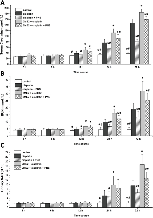 Figure 1: Serum creatinine, BUN and urinary NAG levels in rats at different time points. (A) Scr (B) BUN and (C) urinary NAG levels in control, cisplatin, cisplatin + PNS, 2ME2 + cisplatin and 2ME2 + cisplatin + PNS groups of rats are shown. Note: Data are represented as mean ± SD (n = 6). * denotes P < 0.05 compared with the cisplatin group, # denotes P < 0.05 compared with the 2ME2 + cisplatin group.