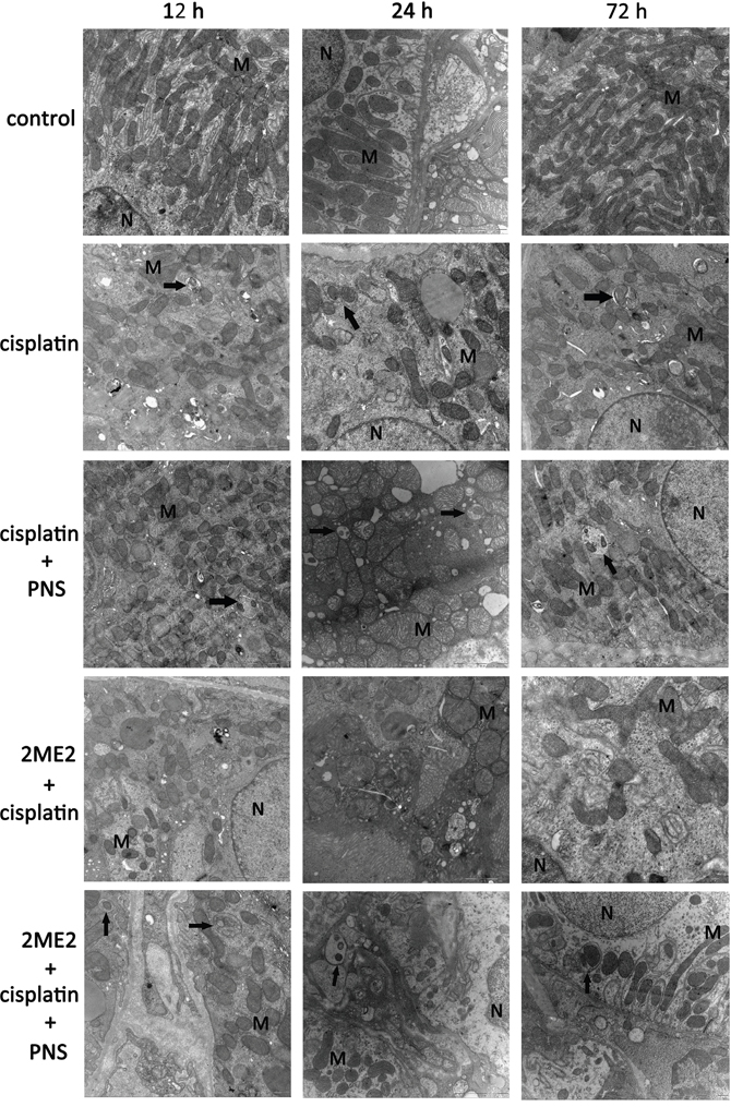 Transmission electron micrograph (TEM) images revealed swollen mitochondria with vague, fractured or absent cristae in the cisplatin group compared to the control (Figure 3). The 2ME2 + cisplatin group showed more damaged mitochondria compared to the cisplatin group from 12h to 72h. Conversely, the cisplatin + PNS group showed reduced mitochondrial damage compared to the cisplatin group. The 2ME2 + cisplatin + PNS group also showed reduced mitochondrial damage compared to the 2ME2 + cisplatin group (Figure 3).