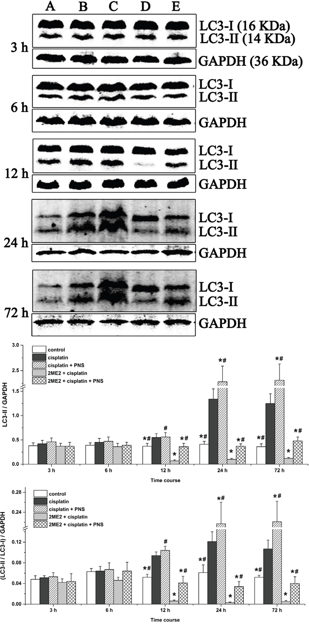 Figure 4: Western blotting analysis of LC3 expression in rat renal tissues. LC3 expression in renal tissues from (A) control, (B) cisplatin, (C) cisplatin + PNS, (D) 2ME2 + cisplatin, (E) 2ME2 + cisplatin + PNS groups is shown. Note: Data are represented as mean ± SD (n = 4). * denotes P < 0.05 compared with the cisplatin group; # denotes P < 0.05 compared with the 2ME2 + cisplatin group.