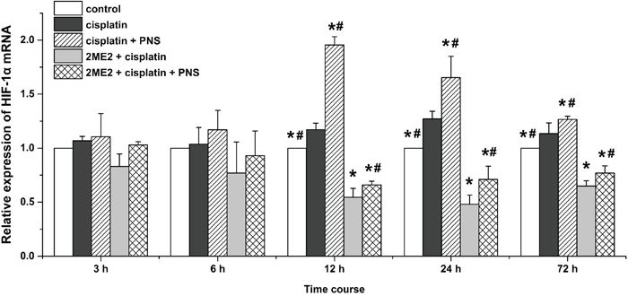 Figure 5: Quantitative RT-PCR analysis of HIF-1α mRNA expression. Relative expression of HIF-1α mRNA in renal tissues from control, cisplatin, cisplatin + PNS, 2ME2 + cisplatin and 2ME2 + cisplatin + PNS groups of rats at different time points is shown. Note: Data are represented as mean ± SD (n = 3). * Denotes P < 0.05 when compared with the cisplatin group, # denotes P < 0.05 when compared with the 2ME2 + cisplatin group.