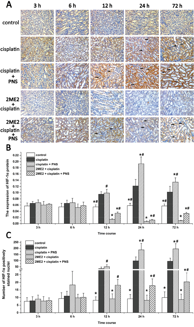 In the renal tissues from the control group, HIF-1α protein was localized predominantly in the cytoplasm (Figure 6A). The cisplatin group (12h to 72h) showed increased nuclear localization of HIF-1α compared to the control group (Figure 6A and 6C). However, the 2ME2 + cisplatin group (12h to 72h) showed decreased nuclear localization of HIF-1α compared to the cisplatin group. Moreover, we observed increased nuclear HIF-1α in the cisplatin + PNS (24h and 72h) compared to the cisplatin group, as well as in the 2ME2 + cisplatin + PNS group (12h to 72 h) compared to the 2ME2 + cisplatin group (Figure 6A and 6C).