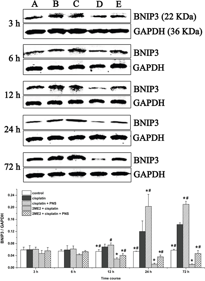Figure 8: Western blotting analysis of BNIP3 expression in rat renal tissues. Quantitative analysis of BNIP3 expression in renal tissues from (A) control, (B) cisplatin, (C) cisplatin + PNS, (D) 2ME2 + cisplatin, (E) 2ME2 + cisplatin + PNS groups is shown. Note: Data are represented as mean ± SD (n = 4). * denotes P < 0.05 compared with the cisplatin group; # denotes P < 0.05 when compared with the 2ME2 + cisplatin group.