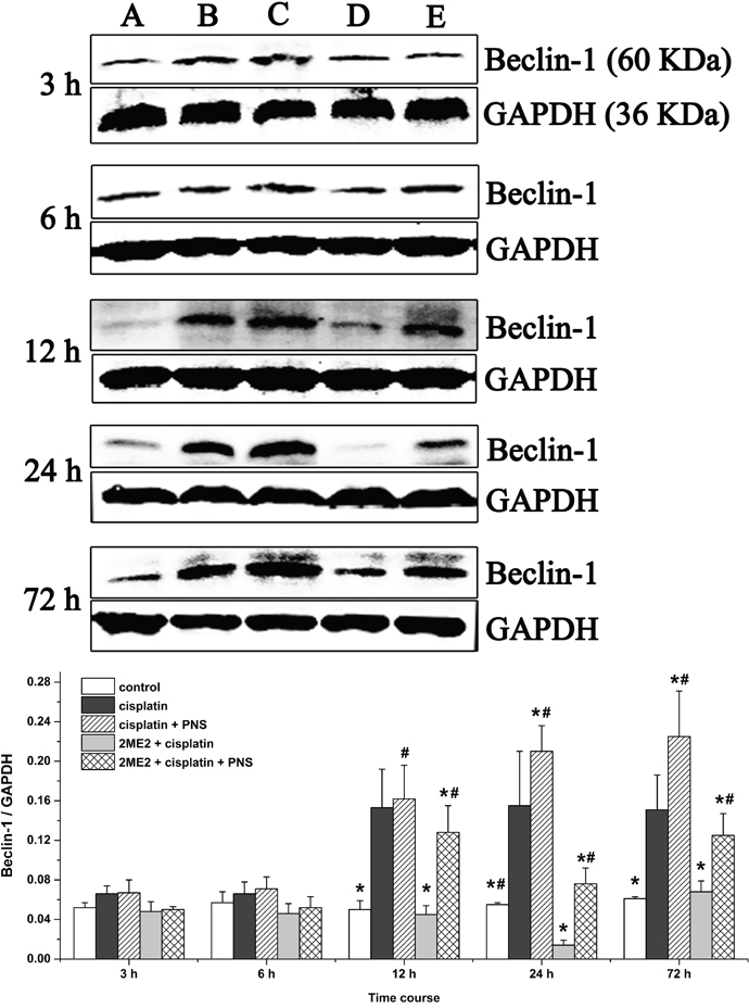 Figure 9: Western blotting analysis of Beclin-1 expression in rat renal tissues. Beclin-1 expression in renal tissues from (A) control, (B) cisplatin, (C) cisplatin + PNS, (D) 2ME2 + cisplatin, (E) 2ME2 + cisplatin + PNS groups is shown. Data are represented as mean ± SD (n = 4). *denotes P < 0.05 compared with the cisplatin group; # denotes P < 0.05 when compared with the 2ME2 + cisplatin group.