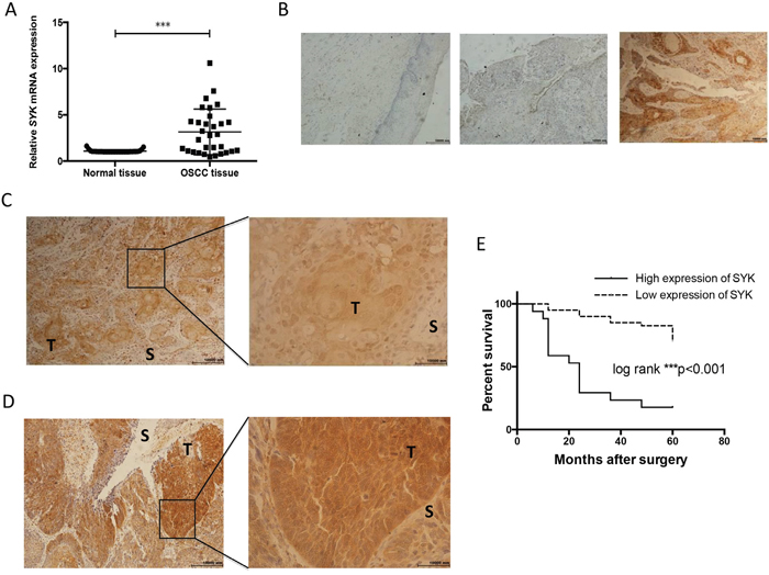 Figure 1: SYK is significantly over-expressed in cancerous tissues and assocaited with overall survival. (A): Relative expression of SYK in OSCC tissues in comparison with adjacent, histologically normal tissues (n=31). The SYK mRNA level in tumor tissues was normalized to normal tissues. (B): Staining of SYK in normal tissues (left). Staining of SYK in OSCC tissues, SYK-negative (middle) and SYK-positive (right) expression in epithelial layers. (magnification, ×100). (C and D): Different patterns of SYK expression (C): Cytoplasmic and nuclear staining; (D): Predominantly cytoplasmic staining; T, tumor; S, stroma; magnification, ×100 left and ×400 right) in OSCC tissues. (E): Kaplan-Meier curves for the overall survival rate of p OSCC patients were calculated based on SYK expression (high versus low) determined by IHC. Log-rank test was used to compare the significance of the two curves.