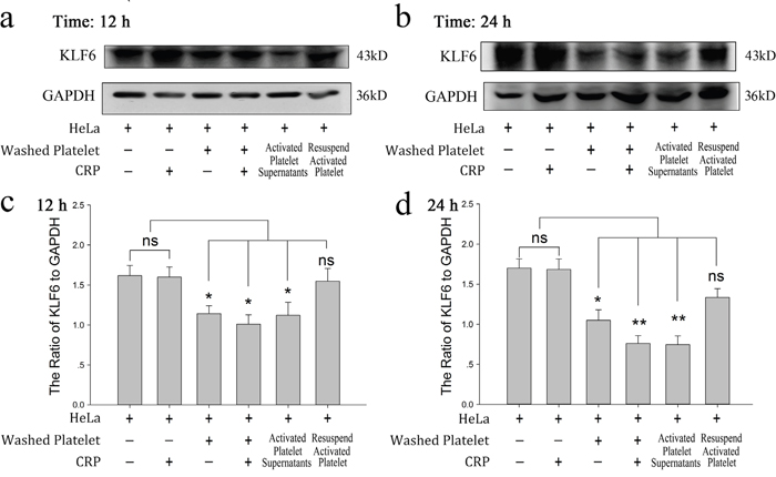 Figure 2: Effect of platelets on HeLa cells via reduced KLF6 expression. (a-b) HeLa cells were incubated with resting platelets, platelets treated withspecific stimulator CRP (0.8 μg/ml), washed platelets, washed platelets plus CRP, releasates of CRP-activated platelets, and the resuspended CRP-activated platelets pellet. KLF6 expression was measured by Western blot analysis in HeLa cells after a 12-hour (a) or 24-hour (b) treatment. (c-d) Quantitative analysis of the ratio of KLF6 levels to GAPDH is shown; data are presented as the mean ± SEM (n = 8, *p<0.05 and **p<0.01 compared with control).