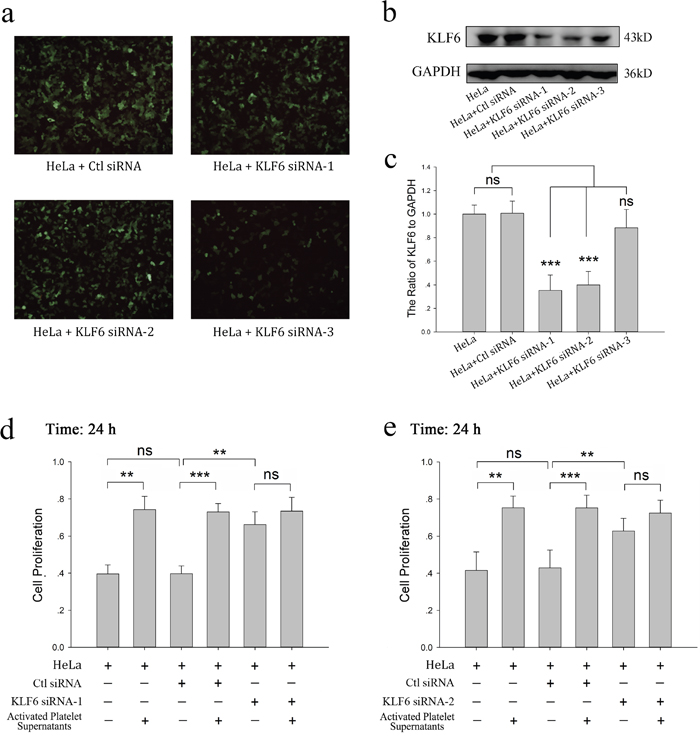Figure 3: KLF6 gene silence dampened the proliferative effect of platelets on HeLa cells. (a-c) HeLa cells grown on 6-well plates were transfected with either control siRNA (Ctl siRNA) or 3 different KLF6 siRNAs (KLF6 siRNA-1, KLF6 siRNA-2 and KLF6 siRNA-3) for 48 hour. The expression of green fluorescence protein (GFP) was measured by a fluorescence microscope with 100X magnification (a). Four days after transfection, KLF6 expression was visualized by Western blot analysis (b). GAPDH was used as a loading control. (c) The ratio of KLF6 level to GAPDH summarized as a bar graph, data are presented as the mean ± SEM (n = 4, ***p<0.001 compared with control). (d-e) Normal HeLa cells, HeLa cells transfected with control vector, KLF6 siRNA-1 (d) or KLF6 siRNA-2 (e) were incubated with CRP (0.8 μg/ml)-activated platelet releasates. The MTT assay was performed to determine cell proliferation after a 24-hour incubation, and cells cultured in fresh medium were compared as control. Data are presented as the mean ± SEM (**p<0.01, ***p<0.001 compared with controls). Five duplicate wells were set up for each group, and the experiment was repeated six times.
