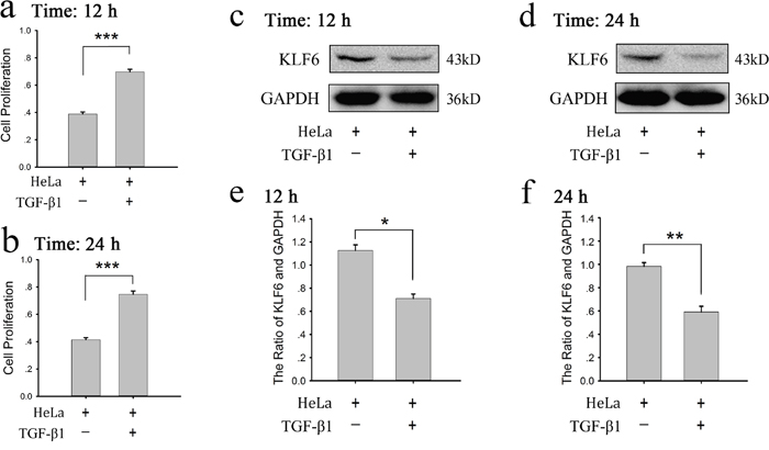 Figure 4: Recombinant TGF-β1 increased proliferation and decreased KLF6 expression of HeLa cells. (a-b) HeLa cells were treated with human recombinant TGF-β1 (10 ng/ml) for 12 (a) or 24 (b) hours, the proliferation of cells was assessed by MTT assay. Cells cultured in fresh medium were compared as a control. The results are expressed as the mean ± SEM (***p<0.001 compared with control). Five duplicate wells were set up for each group, and the experiment was repeated 3 times. (c-f) HeLa cells were treated with TGF-β1 (10 ng/ml) for 12 (c) or 24 (d) hours, expression of KLF6 was measured by a western blot analysis. Cells cultured in fresh medium were used as a control. A quantitative analysis of the ratio of KLF6 to GAPDH expression is shown (e-f), and data are presented as the mean ± SEM (n = 3, *p<0.05, **p<0.01 compared with control).