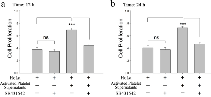 Figure 5: Platelet derived TGF-β promotes HeLa cell proliferation. (a-b) Supernatants from CRP (0.8 μg/ml)-activated platelets (2×108/ml) were isolated by centrifugation at 1000×g for 10 min. HeLa cells were treated with the platelet supernatants in the absence and presence of the TGF-β receptor inhibitor SB431542 (10μM). The MTT assay was used to determine the proliferation effects of the releasates from activated platelets on HeLa cells at 12 hour (a) or 24 hour (b). HeLa cells cultured in fresh medium were used as control. Each experiment was repeated 10 times in triplicate. Data are presented as the mean ± SEM (n = 10, ***p<0.001 compared with controls).