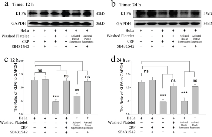 To demonstrate the role of platelet-derived TGF-β in HeLa cell growth, SB431542, a TGF-β receptor blocker, was incubated with HeLa cells before treated with platelet or its releasate. The promoting effect of platelet secretion on the proliferation of HeLa cells was reversed by SB431542 (Figure 5a and 5b). Both CRP (0.8 μg/ml)-treated platelets and their releasate could reduce the expression of KLF6 at the 12 and 24 hour time points (Figure 6a and 6b), which promoted proliferation of HeLa cells. These effects could be blocked by the TGF-β receptor inhibitor (10 μM) (Figure 6a–6d).