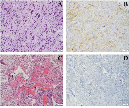 Figure 3: PD-L1 staining on TCs in metastatic sites. (A) H&E staining of lung metastasis of a high grade urothelial carcinoma, (B) with high score of PD-L1 (IC2/3) expression; (C) bone metastasis (H&E), (D) being completely negative for PD-L1 (IC0).