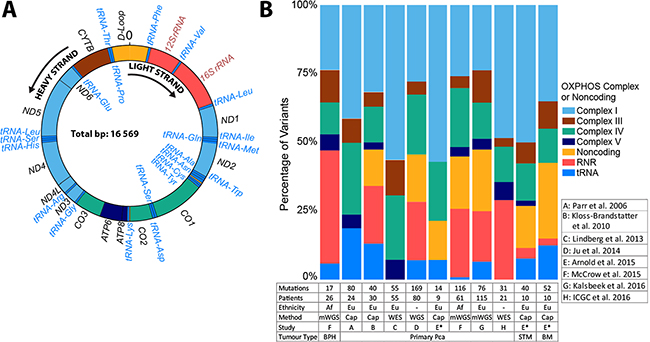Mutations in the mitochondrial genome (mtDNA) have been implicated in both the initiation and progression of cancer, including prostate cancer (PCa). Oncogenic mtDNA mutations are hypothesized to play a role in the metabolic shift, from oxidative phosphorylation (OXPHOS) to aerobic glycolysis, referred to as the Warburg effect [1, 2]. A dysregulation of these processes could cause a general instability of mitochondrial homeostasis, thus impacting other mitochondrial functions such as apoptosis and calcium homeostasis [3]. Multiple reviews have addressed the importance of mitochondrial function in cancers [4–7]. As cancer cells require functional mitochondria, it is assumed that a fine balance exists in the type, frequency and number of mtDNA mutations a cancer cell can tolerate. Additionally, the oncogenic impact of acquired mtDNA mutations will depend on any inherited or ancestral mtDNA variation. Each of these distinct categories will be introduced and discussed in further detail in relation to PCa.