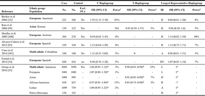 1Power calculations performed using a genetic power calculator [102] assuming a population PCa prevalence of 0.000548 [103], using the haplogroup frequencies as reported in the studies. 2U-haplogroup targeted analysis for 71 cases and 128 controls (excluded for PCa) reported an association with PCa (OR = 2.75, 95% CI 1.2–6.3) [32].