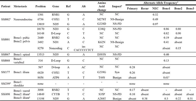 Abbreviations: Ref, the revised Cambridge Reference Sequence (rCRS) allele; Alt, alternative (mutated) allele; Recur, local recurrence; NEC, neuroendocrine; NC, noncoding; NS, non-synonymous SNV; PD, probably damaging; Syn, Synonymous SNV.