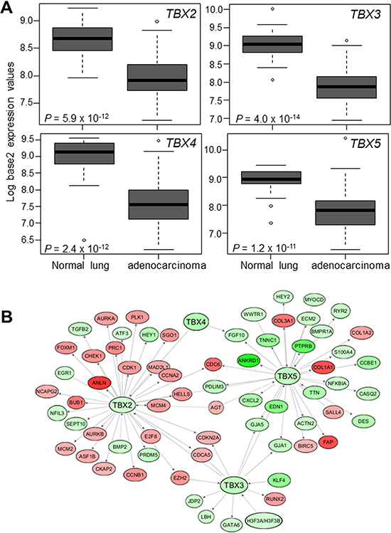 Figure 2: Suppressed expression of the TBX2 subfamily in human NSCLC. (A) Expression levels of TBX2 subfamily were probed in a normalized expression dataset of 80 LUADs and 30 normal lung tissues we previously reported [23]. Expression differences were statistically analyzed using Wilcoxon rank sum tests. Boxes represent 25%–75% ranges. Solid horizontal lines represent median values. (B) Known downstream TBX2 subfamily target genes that are differentially expressed between LUADs and normal lung tissues (FDR < 0.05, fold-change ≥ 2), along with the subfamily itself, were organized into gene networks using Ingenuity Pathways Analysis (IPA) (red; up-regulated in tumors; green, down-regulated).