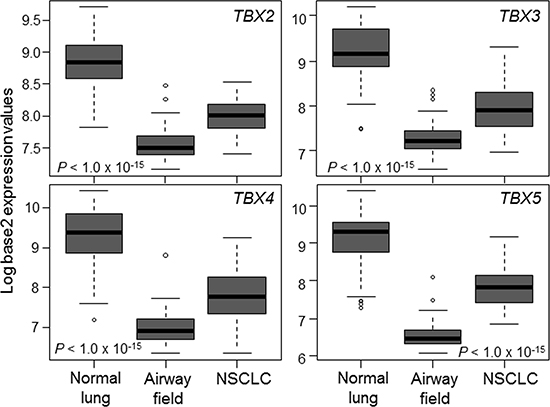 Figure 4: Suppressed expression of the TBX2 subfamily in the normal-appearing airway cancerization field. Expression levels of the TBX2 subfamily were interrogated in a normalized dataset we previously reported [27] and that is comprised of matched NSCLCs, multiple adjacent cytologically-normal small airway brushings and distant normal lung tissues (see Materials and Methods section). Differences in expression among the three groups were statistically analyzed using the Kruskal-Wallis test. Boxes represent 25%–75% expression ranges and solid horizontal lines represent median values.