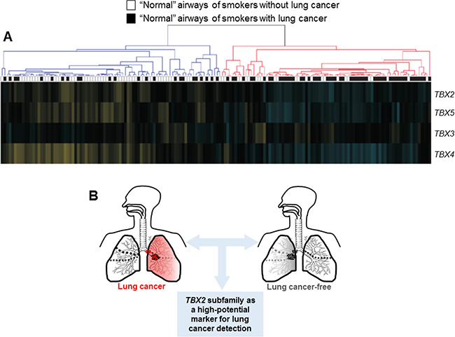 Figure 5: Suppression of the TBX2 subfamily in the airway field of injury in smokers. (A) TBX2 subfamily expression levels were analyzed in the dataset by Spira and colleagues [28] comprised of uninvolved mainstem bronchi from 164 suspect smokers with and without lung cancer. Following re-normalization (see Materials and Methods) section, the samples were clustered based on TBX2 subfamily expression (blue; down-regulated, yellow; up-regulated compared to the median). Statistical analysis of differences in the numbers of smokers with and without lung cancer between the two clusters was performed using the Fisher’s exact test. (B) Schematic illustration depicting that the TBX2 subfamily may serve as a high-potential bronchial four-gene classifier for early detection of lung cancer in smokers.