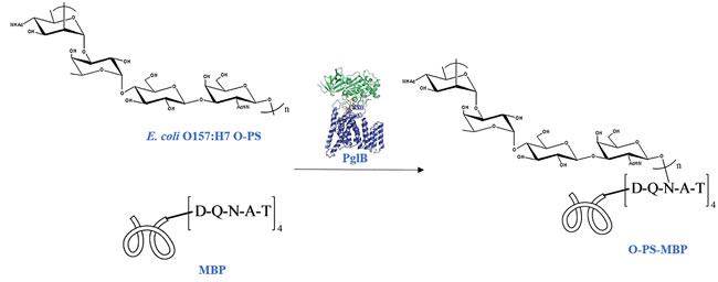 Figure 1: Schematic for biosynthesis of O-PS-MBP. In E. coli CLM24 periplasm, transmembrane protein PglB catalyzes the conjugation of E. coli O157:H7 O-PS with the reducing end GalNAc to the asparagine residue amino acid sequence (DQNAT)4 within carrier protein MBP.