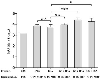 Figure 4: Anti-O-PS IgG titers. Sera from priming with peptides and immunization of O-PS-MBP were tested for anti-O-PS IgG titers. Differences were indicated with symbols (*: P < 0.05; ***: P < 0.001; n.s.: P > 0.05). Results were expressed as the arithmetic mean ±SD indicated by error bars.