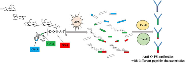 Figure 5: The proposed mechanism of adaptive immune system activation by glycoconjugate O-PS-MBP. O-PS-MBP is trimmed into peptides and glycopeptides in APC. Herein, glycopeptides have two parts, peptide epitopes and PS epitopes. Those peptide epitopes help present PS epitopes to T and B cells to generate PS-specific antibodies. Correspondingly, peptide epitopes could not present themselves to T and B cells to generate peptide epitope-specific antibodies. Meanwhile, the immunogenicity properties of peptide epitopes are transferred to PS epitopes. In other words, the profile of generated PS-specific antibodies depends on the characteristics of peptide epitopes.