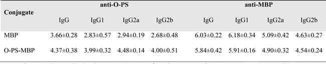 Table 1: Mean titers of serum anti-O-PS and anti-MBP antibodies elicited in mice by injection of MBP and O-PS-MBP.