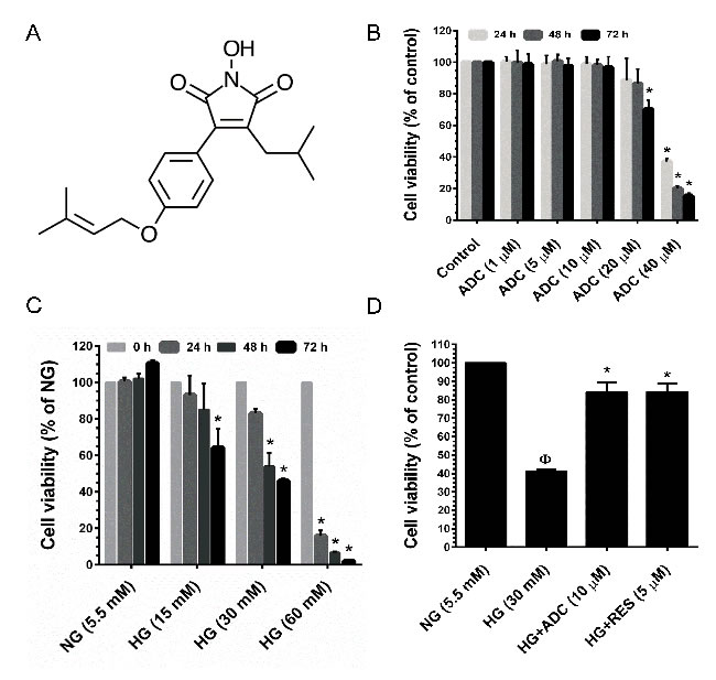 Figure 1: Cytotoxic effect of HG and ADC on HUVECs. A. Chemical structure of Antrodin C (ADC). B. HUVECs were incubated with increasing concentrations of ADC for 24-72 h and the cell viability was measured by MTT assay. The percentage of cell viability was compared with the control (0.01% DMSO) group. C. HUVECs were incubated with various doses of HG for 24-72 h and cell viability was measured by MTT assay. The percentage of cell viability was compared with the NG treatment group. D. Cells were incubated with HG in the presence or absence of ADC or RES for 72 h. The percentage of cell viability was compared with the NG treatment group. Values represent the mean ± SD of three independent experiments. Statistical significance was set at ФP < 0.05 compared to NG vs. HG and *P < 0.05 compared to HG vs. samples.