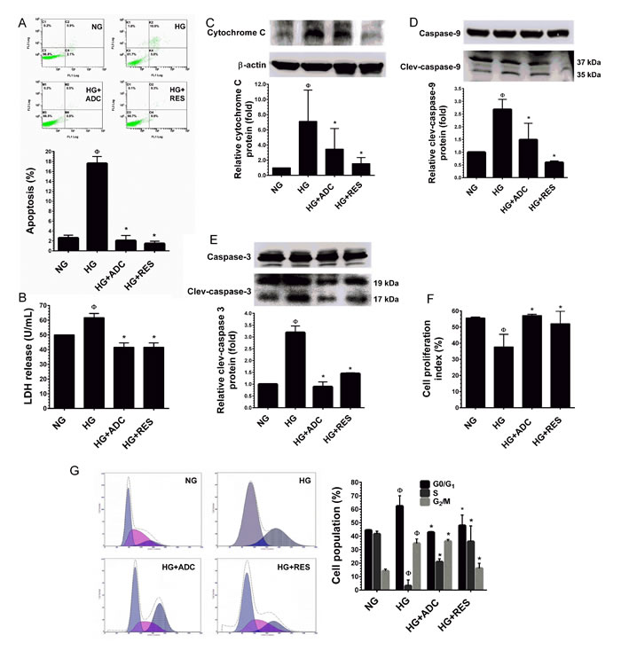 Figure 2: Protective effect of ADC on HG-induced HUVEC apoptosis and growth arrest. A. HUVECs were incubated with HG in the presence or absence of ADC or RES for 72 h. Apoptotic cell death was performed with Annexin V/PI staining and the hypodiploid DNA was determined by flow cytometry. B. HUVECs were treated with HG in the presence or absence of ADC or RES for 72 h. LDH release in the supernatant of HUVEC cultures was measured by LDH assay kit as described in Materials and Methods. C.-E. Protein expression levels of cytochrome C, caspase-9 and caspase-3 levels were determined by western blot analysis. The relative protein expression of cytochrome C was normalized with β-actin, whereas cleaved capase-9 and cleaved caspase-3 levels were normalized with pro-caspase-9 and pro-caspase-3, respectively. F. HUVECs proliferation index was determined by flow cytometry. G. HUVECs were incubated with HG in the presence of ADC or RES for 72 h. Cell-cycle distribution was measured by flow cytometer using PI. Percentage of cell population in each transition phase is shown in the histogram. Values represent the mean ± SD of three independent experiments. Statistical significance was set at ФP < 0.05 compared to NG vs. HG and *P < 0.05 compared to HG vs. samples.