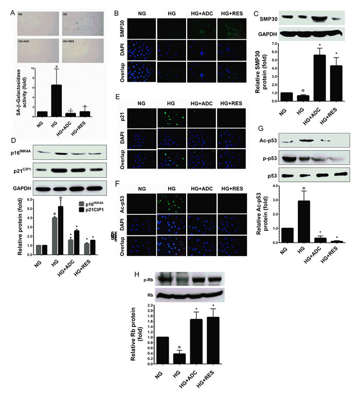Figure 3: ADC prevents HG-induced senescence in HUVECs. To determine the effect of ADC on HG-induced senescence, HUVECs were incubated with HG in the presence or absence of ADC or RES for 72 h. A. Cellular senescence was determined by SA-β-gal assay. The top panel shows representative figures and the lower panel shows quantitative analysis of SA-β-gal positive cells per microscopic field. B.,E.,F. The protein expression of SMP30, p21CIP1 and acetylated p53 was measured by immunofluroscence using specific primary antibodies and FITC-conjugated secondary antibody (green). The cellular localization of SMP30, p21CIP1 and acetylated p53 was photographed using a fluorescence microscope. DAPI was used to stain the nucleus. C. SMP30 protein expression level was determined by western blot analysis and the relative SMP30 expression was normalized with GAPDH. D. Senescence-associated protein p21CIP1 and p16INK4A levels were determined by western blotting and the relative protein levels were normalized with GAPDH. G.,H. The protein levels of acetylated p53, phosphorylated p53 and phosphorylated Rb levels were measured by western blot analysis. The relative protein levels of ac-p53 and p-Rb were normalized with total p53 and total Rb levels, respectively. Values represent the mean ± SD of three independent experiments. Statistical significance was set at ФP < 0.05 compared to NG vs. HG and *P < 0.05 compared to HG vs. samples.