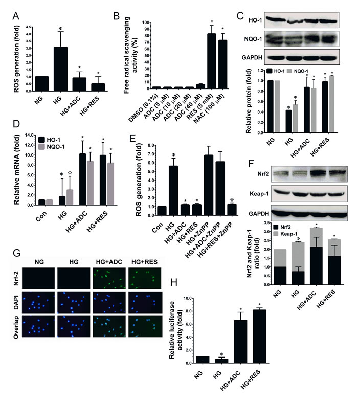 Figure 4: ADC activates Nrf2-dependent anti-oxidant defense in HUVECs. A. To determine the ROS inhibitory effect of ADC, HUVECs were incubated with HG in the presence or absence of ADC or RES for 24 h. After incubation, intracellular ROS was measured by spectrometer using DCFH2-DA flurogenic probe. B. The free-radical scavenging activity of ADC was determined by DPPH assay. NAC and RES were used as positive controls. C.,F. Cells were treated with HG in the presence or absence of ADC or RES for 24 h. The protein levels of HO-1, NQO-1, Nrf2 and Keap-1 were determined by western blot analysis. D. To quantify the mRNA expression levels of HO-1 and NQO-1, HUVECs were incubated with HG in the presence or absence of ADC or RES for 24 h. Total RNA was subjected to Q-PCR analysis. Relative mRNA levels were normalized with β-actin mRNA. E. HUVECs were pre-treated with ZnPP (10 mM) for 2 h and then incubated with HG in the presence or absence of ADC or RES for 24 h. Intracellular ROS was quantified by spectrophotometer. G. The protein expression and nuclear localization of Nrf2 was determined by immunofluorescence analysis. The subcellular and nuclear localization of Nrf2 was photographed using a fluorescence microscope. DAPI was used to stain the nucleus. H. To determine the Nrf2 transcriptional activity, HUVECs were transiently transfected with ARE promoter construct using ipofectamine and incubated with HG in the presence or absence of ADC or RES for 6 h. Cell lysates were mixed with luciferase reagents and quantified using an illuminometer. The fold change of relative ARE promoter activity was compared with untreated cells (NG). Values represent the mean ± SD of three independent experiments. Statistical significance was set at ФP < 0.05 compared to NG vs. HG, *P < 0.05 compared to HG vs. samples and ΘP < 0.05 compared to HG vs. ZnPP pre-treatment group.