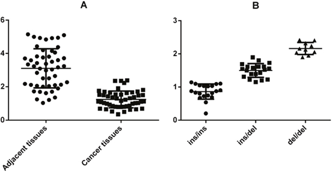 Next, we further examined the expression of GAS5 in lung cancer and adjacent tissue samples with different genotypes. As shown in Figure 1, the expression levels of lncRNA GAS5 in lung cancer tissues were significantly lower than those in the corresponding normal tissues (P<0.01, Figure 1A). Also the relative GAS5 expression level in samples with del/del genotype was significantly higher than that in samples with ins/del and ins/ins genotype (P<0.01, Figure 1B).