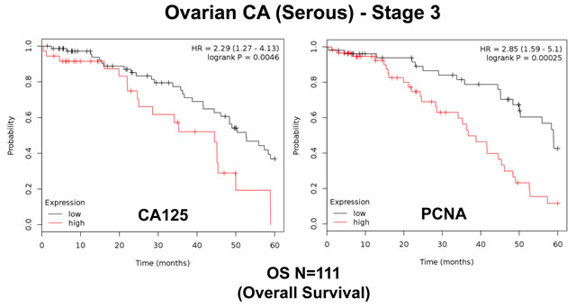 Thus, a subset of conventional markers (CA125 and PCNA) can be used to predict overall survival in ovarian cancer patients.