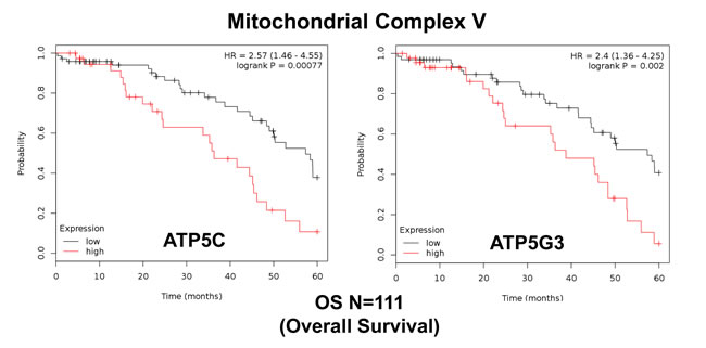 Figure 7: Mitochondrial complex V proteins are associated with poor clinical outcome in ovarian cancer patients. Note that high levels of ATP5C and ATP5G3 predict significantly reduced overall survival.