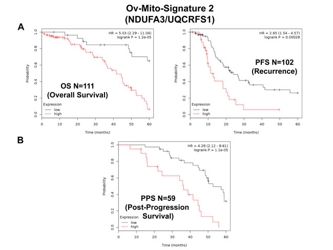 Figure 10: Ov-Mito-Signature 2 predicts patient outcome in ovarian cancer patients. Note that high levels of Ov-Mito-Signature 2 (NDUFA3/UQCRFS1) effectively predicts overall survival (OS), progression-free survival (PFS) and post-progression survival (PPS). OS and PFS are shown in panel A. PPS is shown in panel B.