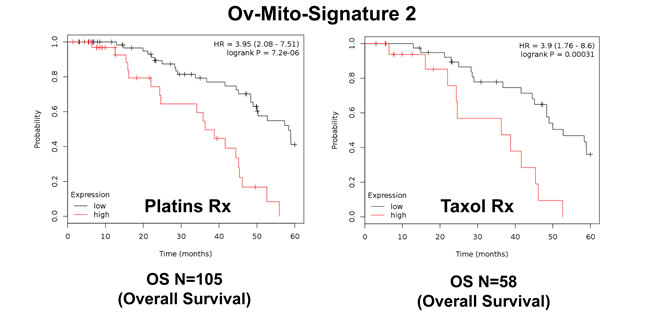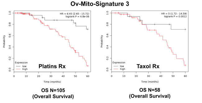 Figure 9: Ov-Mito-Signature 1 predicts the response to therapy in ovarian cancer patients. Note that high levels of Ov-Mito-Signature 1 (MRPL49/UQCRFS1) effectively predicts drug-resistance and treatment failure, illustrated here as overall survival. Results with Platin and Taxol therapy (Rx) are shown.
