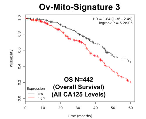 In support of our current hypothesis, integrating telomerase activity with increased mitochondrial function, we demonstrate that a sub-set of mitochondrial gene transcripts are able to predict survival in serous ovarian cancer patients, with optimal de-bulking. As such, these particular mitochondrial markers could ultimately be used to select high-risk ovarian cancer patients at diagnosis, up to 5 years in advance, for close monitoring. As such, our results provide an excellent justification for the therapeutic targeting of mitochondria in ovarian cancer cells, to improve patient survival.