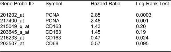 First, we assessed the prognostic value of CA125 in this context. The results of this analysis are shown in Figure 2 and Table 1. Note that the hazard-ratio (HR) for CA125 was 2.29 (p = 0.005) for overall survival (OS). As proliferative markers are often used as key endpoints in Phase II clinical trials, we next assessed the prognostic value of Ki67 and PCNA. Figure 2 and Table 2 both show the prognostic value of these markers. The results with Ki67 were not significant, but PCNA showed a hazard-ratio of 2.85 (p = 0.00025). Similarly, we determined the utility of macrophage-specific markers of inflammation. However, Table 3 shows that that CD68 and CD163 did not show significant prognostic value.