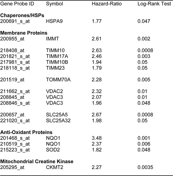 Table 4: Prognostic value of chaperones, mitochondrial membrane proteins, anti-oxidants and creatine kinase