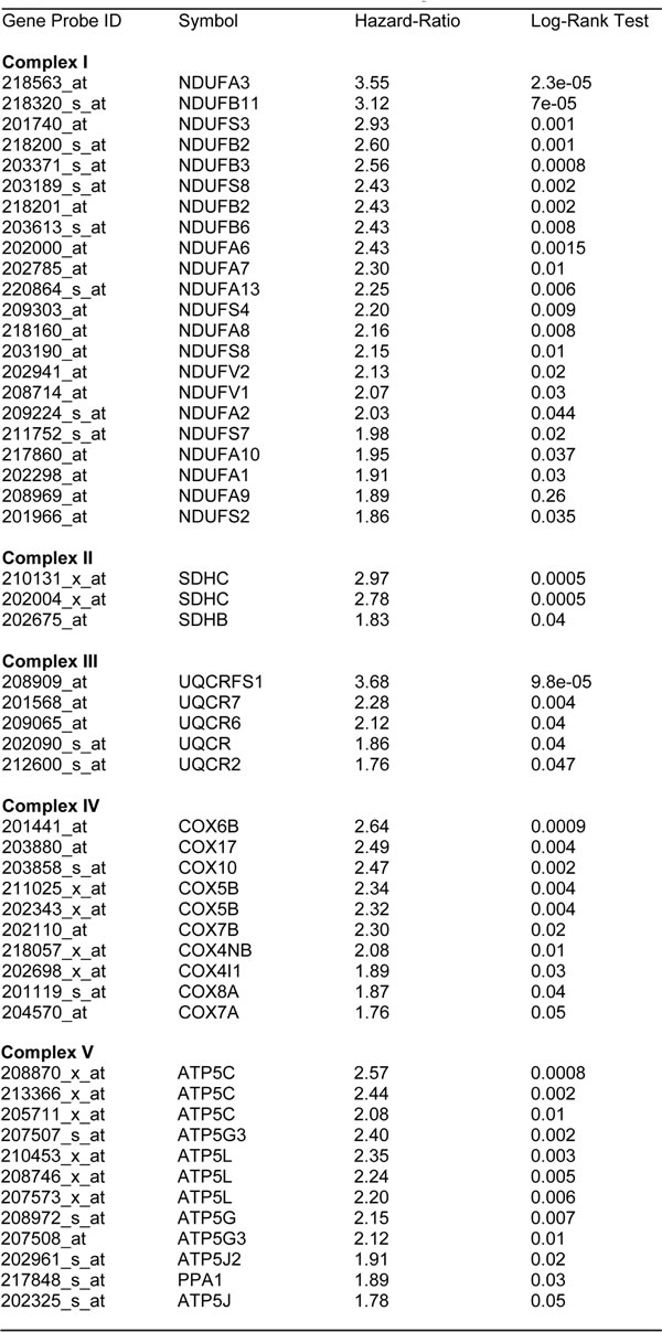 Similarly, we also determined the prognostic value of key components of the OXPHOS complex. These results are summarized in Table 6. Surprisingly, 52 different gene probes for the OXPHOS complexes showed hazard-ratios between 3.68 and 1.76. Complex I had the most subunits with significant prognostic value (21 in total). However, UQCRFS1 (complex III) had the best individual prognostic value (HR = 3.68; p = 9.8e-05). NDUFA3 (complex I) also showed significant prognostic value (HR = 3.55; p = 2.3e-05). Kaplan-Meier curves for members of complex I and II are shown in Figure 5A & 5B, while results with members of complex III and IV are shown in Figure 6A & 6B. Results with complex V are shown in Figure 7.