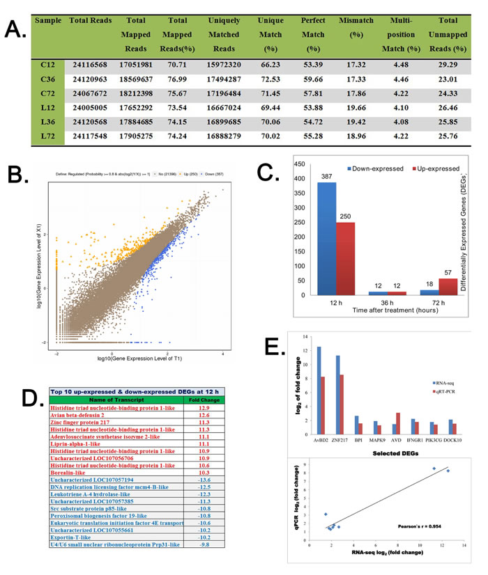 TRIzol (Invitrogen, Carlsbad, CA, USA) was used to isolate total RNA from BF samples and the quality of RNA was assessed using Nanodrop spectrophotometer (Thermo, Waltham, MA, USA) and by gel electrophoresis. For high-throughput sequencing (RNA-seq), 18 BF RNA samples (three time points at 12, 36 and 72 h; three biological replicates at each time point and two treatments,namely, saline and LPS) were selected in equal quantities. Briefly, after construction of strand-specific cDNA libraries, sequencing was performed on Illumina HiSeq 4000 platform by BGI Co., Ltd. (Shenzhen, China). The original raw data was saved in FASTQ/FQ file format. Bowtie2 was used for mapping of clean reads to reference gene and HISAT to reference chicken genome (release: Gallus gallus 5.0). The gene expression was quantified by FPKM (fragments per kilobase per million) method using RSEM (Random-Sampling Empirical Myerson) quantification tool [52]. NOISeq method was used to screen differentially expression genes (DEGs) between two groups (saline vs. LPS) at 12, 36 and 72 h by using absolute fold change ≥ 2 and divergent probability ≥ 0.8 [53].