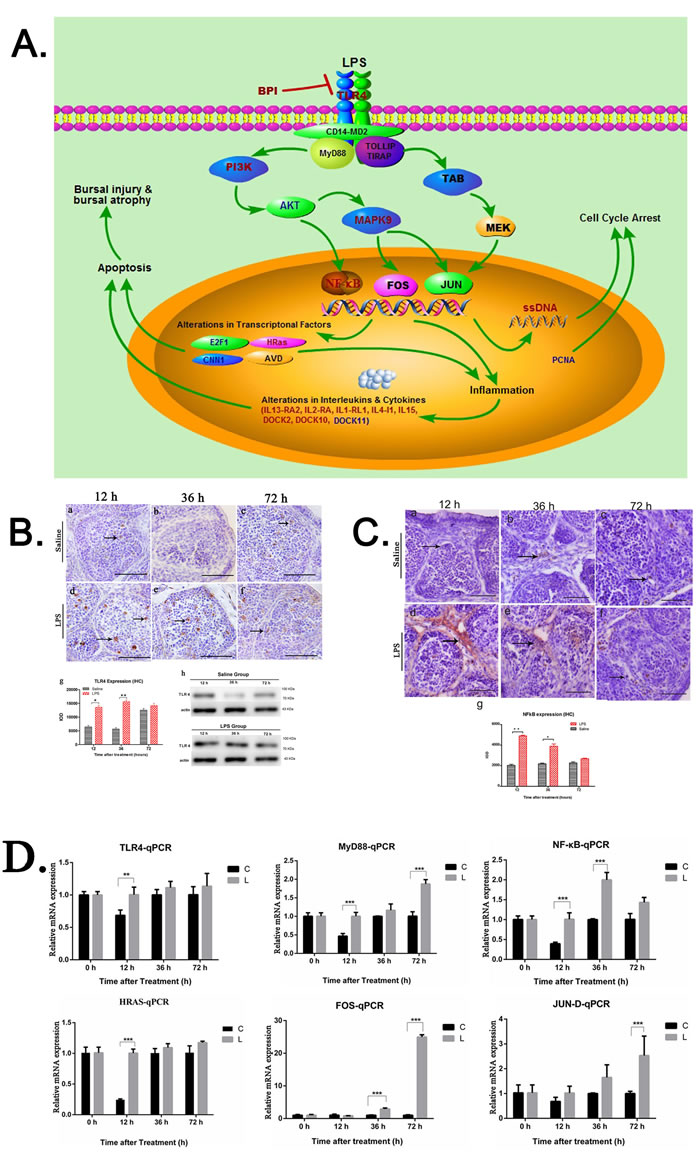 LPS, lipopolysaccharide; BF, bursa of Fabricius; RNA-seq, RNA sequencing; STm, Salmonella enterica serovar Typhimurium; TLRs, toll like receptors; HRH, horseradish peroxidase; PCNA, proliferating cell nuclear antigen; ssDNA, single stranded DNA; IPP, Image-Pro-plus; h, hour/hours; PBS, phosphate buffered saline; H&E, Hematoxylin and Eosin; IHC, Immunohistochemistry; SD, standard deviation; SABC, strept avidin biotin complex; DAB, 3,3’-diaminobenzidine; BSA, bovine serum albumin; NF-κB, nuclear factor-κB; IL, interleukin; G1, growth 1 phase; S phase, DNA synthesis phase; RT-qPCR, quantitative real time polymerase chain reaction; IOD, integrated optical density; TUNEL, terminal-deoxynucleotidyl transferase mediated nick end labeling; POD, peroxide; JNK, c-Jun NH2-terminal kinase; MAPK, mitogen-activated protein kinase; BPI, Bactericidal/permeability-increasing protein; AVD, avidin; CNN1, calponin 1; SEM, scanning electron microscopy; HMDS, hexamethyldisilazane; TdT, terminal deoxynucleotidyl transferase; PVDF, polyvinylidene difluoride; SDS-PAGE, sodium dodecyl sulfate polyacrylamide gel electrophoresis; GO, Gene Ontology; KEGG, kyoto encyclopedia of genes and genomes.